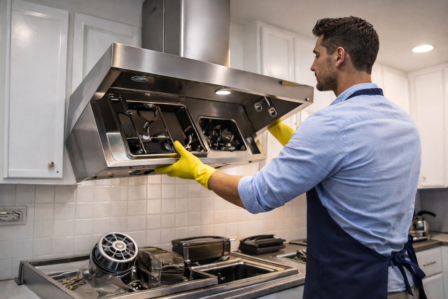 In this process, the chimney is carefully dismantled to access internal components. Removable parts such as filters, baffle trays, internal panels, suction motor housing, and motor blades are cleaned thoroughly to eliminate thick grease, oil residue, and carbon deposits.